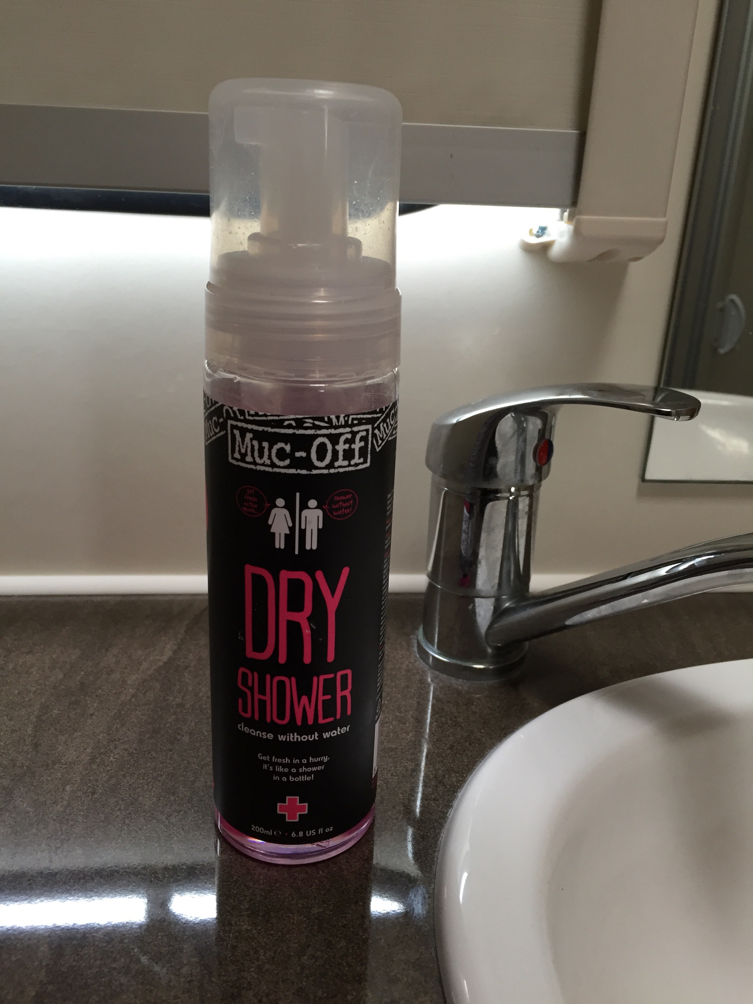 The bottle is a cleverly designed bottle, with a label designed to catch the eye with the pink and black. The pump action dispenser is easily worked giving you a fresh, slightly fragranced foam that’s rubbed easily into the skin. The fragrance smells of coconut and is  suitable for both men and women. Being PH balanced and alcohol free it’s ideal for all skin types, even those with sensitive skin. Application of the foam to the skin instantly starts to refresh, leaving a slight stickiness behind, we found that this could  be towel dried away. It left the skin feeling fresher and clean and takes away any evidence of odour. In the absence of a shower this did what it says on the bottle. Perfect for ridding yourself of body odours after exercising, camping, festivals etc. Not ideal for removing dirt, mud splattered calves from cycling needed a little more work. It also comes in a small handy 50ml bottle, perfect for popping in your rucksack.