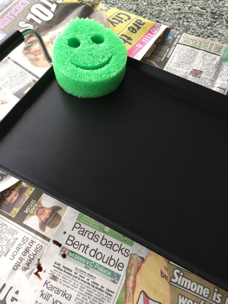 I used dry kitchen roll to wipe away the cold water that came off the sponge and – voila! The sponge rinsed off in lukewarm water washed away any traces of grease returning the sponge to its original state.