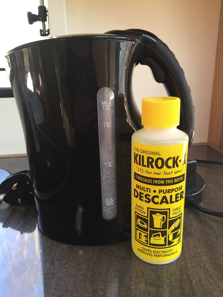 Recommended on the bottle for use on metal and plastic kettles, shower heads, coffee makers, steam irons and even toilet bowls. My item for today’s use is a plastic kettle in my caravan.