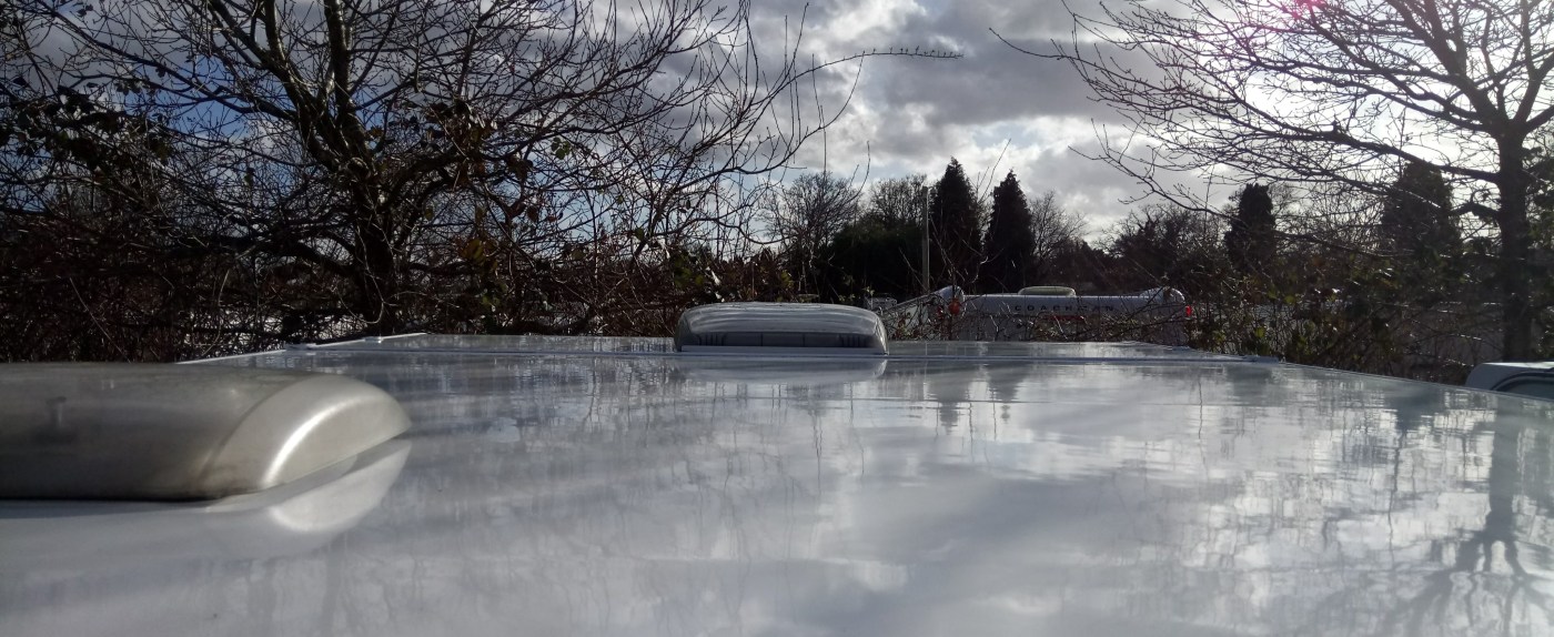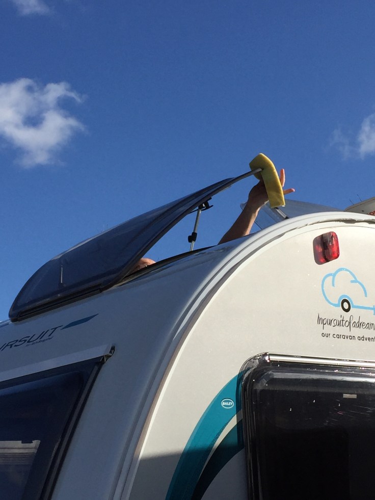The other contains just warm water for rinsing. This one gives more of a trickle than a spray. Not ideal for rinsing. Round and round he goes, his hands are getting cold but he can’t leave me half done. Blooming rinsing water’s run out! Not impressed back in the car and off they drive the one mile home for more water. On their return the light is starting to fade and the temperature is dropping. My skylights are full open and The Boss is wiping round their framework, proper attention to detail.