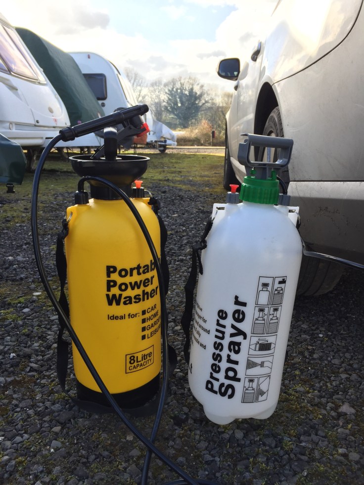 Now for a romantic afternoon. Sleeves are rolled up and soapy sponges tickle and scrub at my sides. He does my roof, slowly and methodically moving the ladders around me. This is where he starts to curse. He bought two different portable pressure washers specifically for this job. There’s no water at the storage yard so he’s hoping the two 8 litre washers are sufficient. One stores warm soapy water and works a treat, once he’s mastered the art of reading the instructions and pumping the handle.