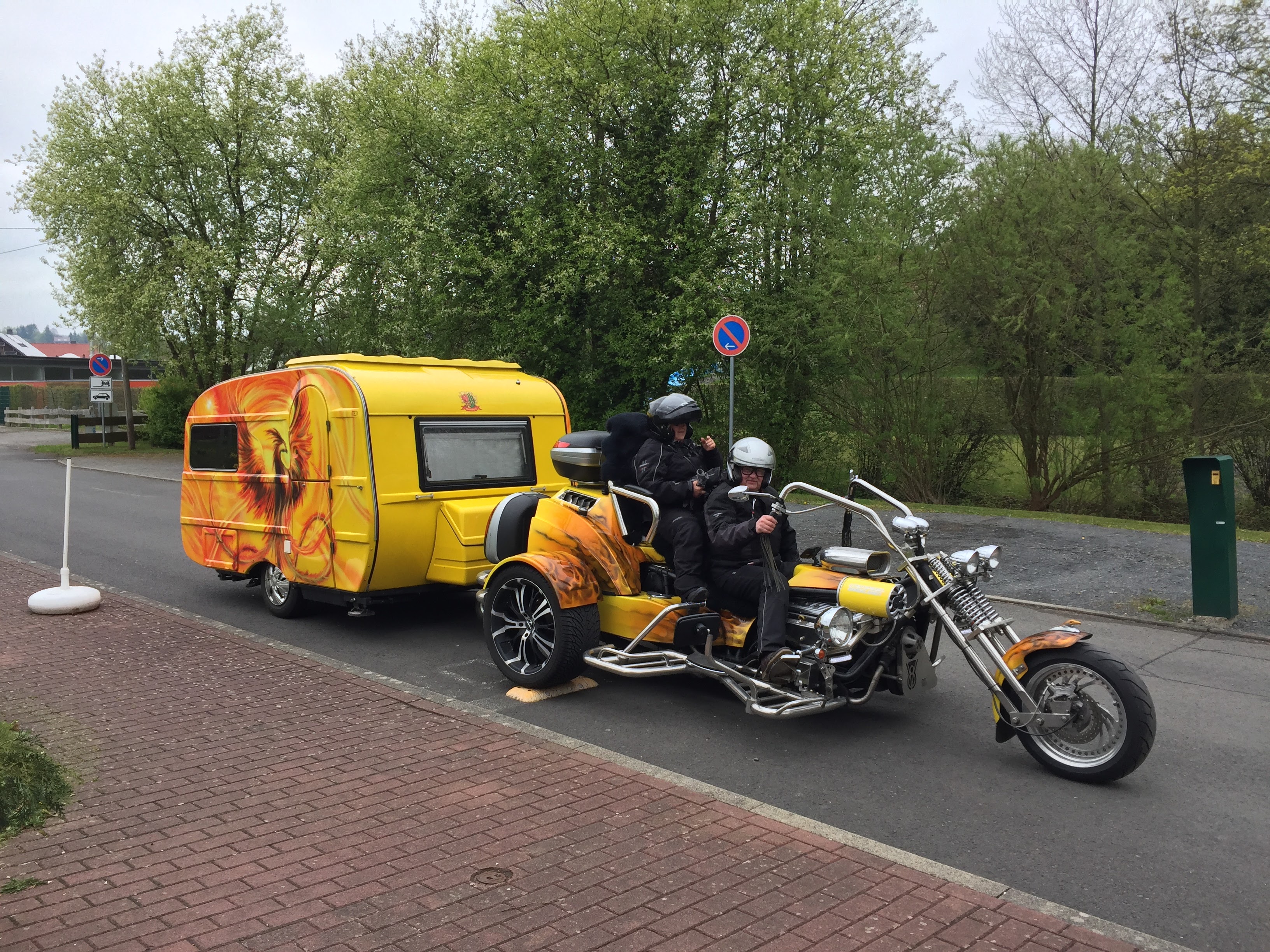 What a set up with the hot-rod trike and caravan. I burst out laughing when I checked out the full size photo and saw the age of the 2 pensioners siting on it! Awesome!