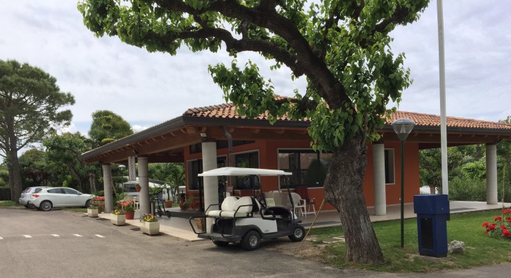The site is on a gentle slope down towards Lake Garda. Reception sits in the middle of the site along with the shop, bar and pool. A lakeside view would be nice so we head down towards the water. There are free pitches but it seems everyone had the same idea. It’s very tree shaded and seems quite cramped. Heading back up towards the top of the site it’s far more open, not as shaded and not as many people. The site is split into tree lined terraces, we choose a pitch and put the legs down.