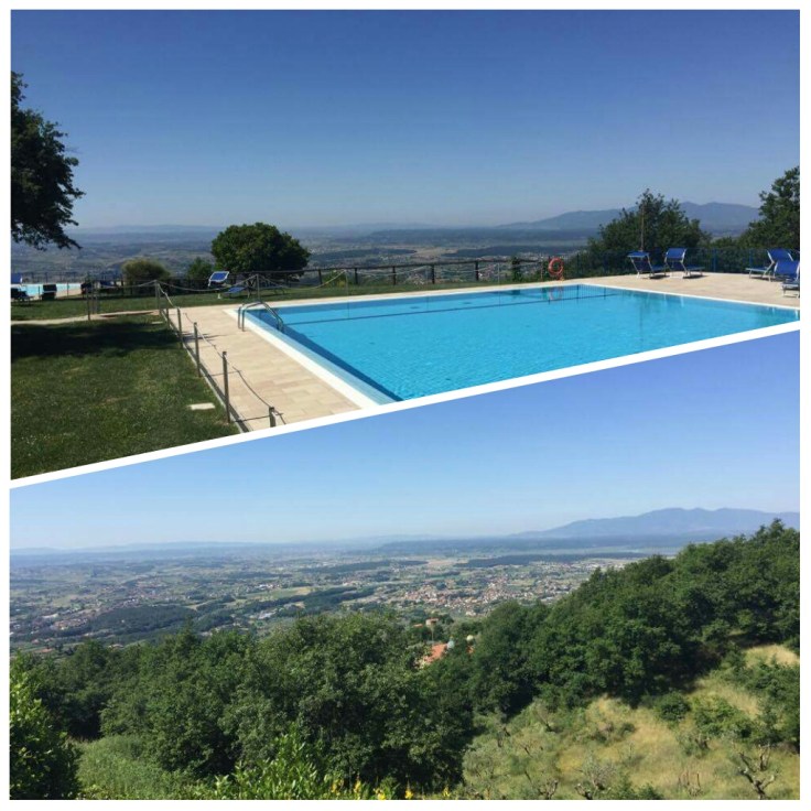 The final eight mile approach to our next caravan campsite site is why we chose it, we are winding and zig-zagging our way up a big big hill with dozens of full-kit cyclists, they are panting with exhaustion we are holding our breaths in anticipation of each corner. The views are amazing both North and South, with that in mind we are ultimately a little disappointed with the campsite as the trees seem to block the view from any standpoint on the hill. The pitches remind us of The New Forest and the weather is ‘scorchio’ so how can we complain, I guess purely because we dragged the caravan up a mountain for a ‘view’ and we don’t have one. Unless you stand by the pool.
