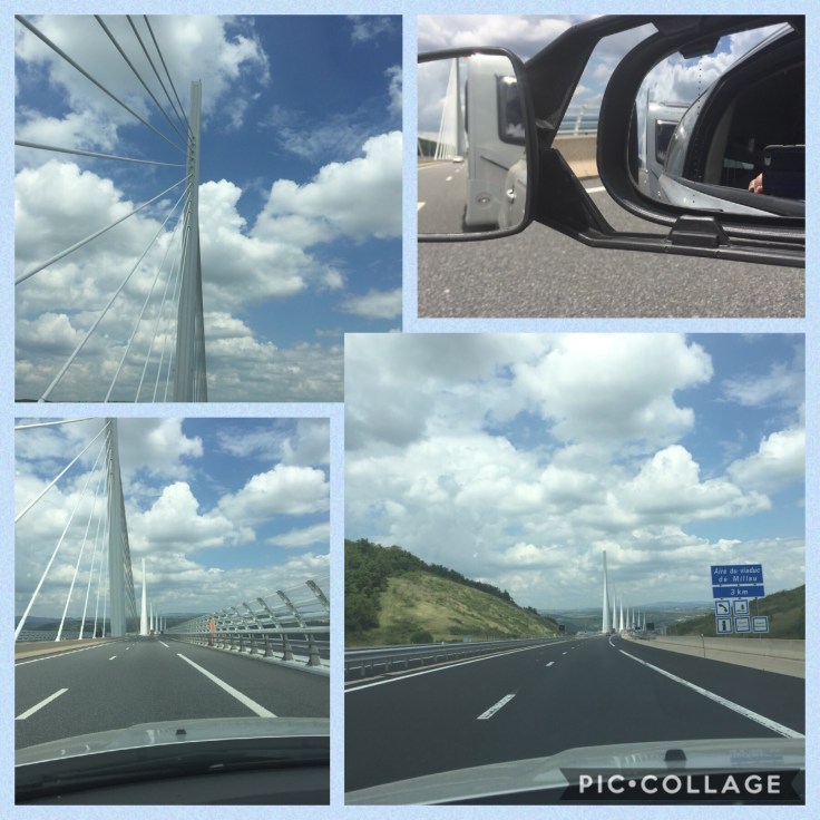 On route he starts getting excited. “Get the camera ready! The Millau Viaduct will soon be in view!” We are still 14 miles away and in this mountainous region we aren’t seeing anything whilst we are down in the valley for a long time. Still I sit, holding the camera on my knees as instructed wishing I’d said it’s too soon to get the camera out. Then when it finally loomed into view after what felt like a life time I could’ve said “I told you so!” My inner child stays quiet and I point the camera and click away. This way and that way hoping I’ve got the shot he wants. Chances of that are slim. In the old days cameras had view finders, this one had a screen in the back in 30° heat and in glaring sunshine the screen appears black, I could be snapping anything.