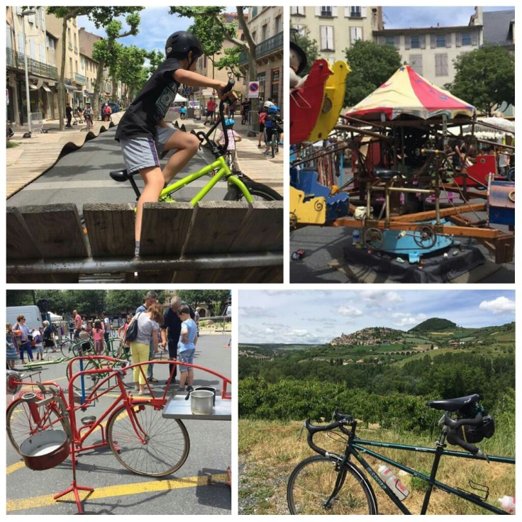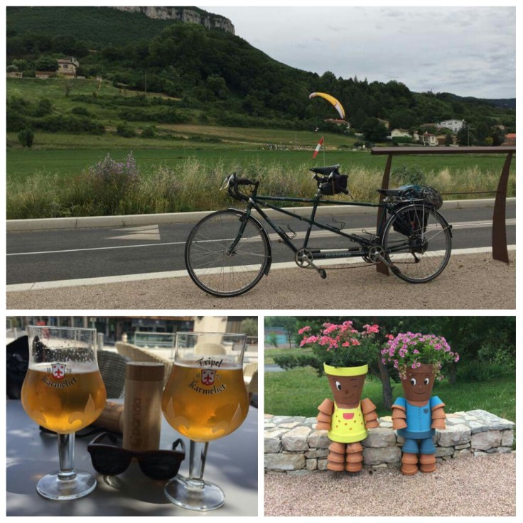 The Boss decides that being up a hill is no excuse and a Tandem Day is planned. As we descend the eight miles into town he points out all the ‘oldies’ effortlessly riding up the hill, “But Steve, those bikes all have electric motors” … No reply. We ride into the centre of Millau, where, ironically, there is a bike festival taking place, and very popular it seems too. After pedalling through the festival with a few French versions of “She’s not pedalling at the back” called from the stalls, we retire to a busy street side bar and order “Deux grandes bières s’il vous plaît” while we watched about twenty paragliders leaping off the mountaintop and circling with ease.