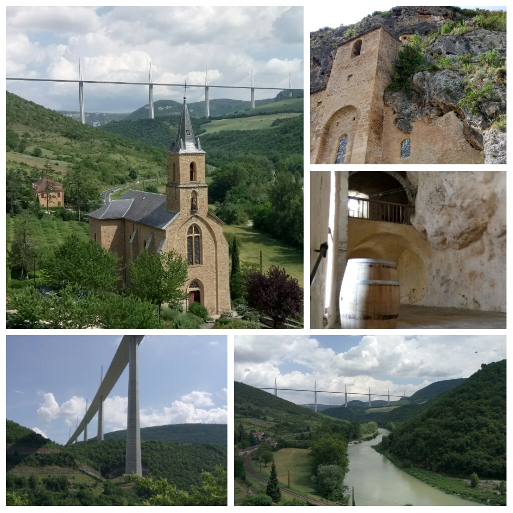 In need of supplies we head towards Millau, apparently the supermarket is near the bridge, hmmm. We pass underneath the bridge but there are no stopping places to take a picture. Before we know it we are driving into a small village, Peyre, that appears to be half built into the rockface, he is instantly distracted and the further appeal of a ‘gratuit’ car park outside the village sealed the deal. Once again we are walking up steep hills to view buildings that were built around the 17th Century. By using the rockface as the rear structure, classed as troglodyte, the residents had strictly ‘forward’ views only, which today, centuries later, was offering a picture frame view of the Millau Viaduct, an interesting mix of old and new in one spot.