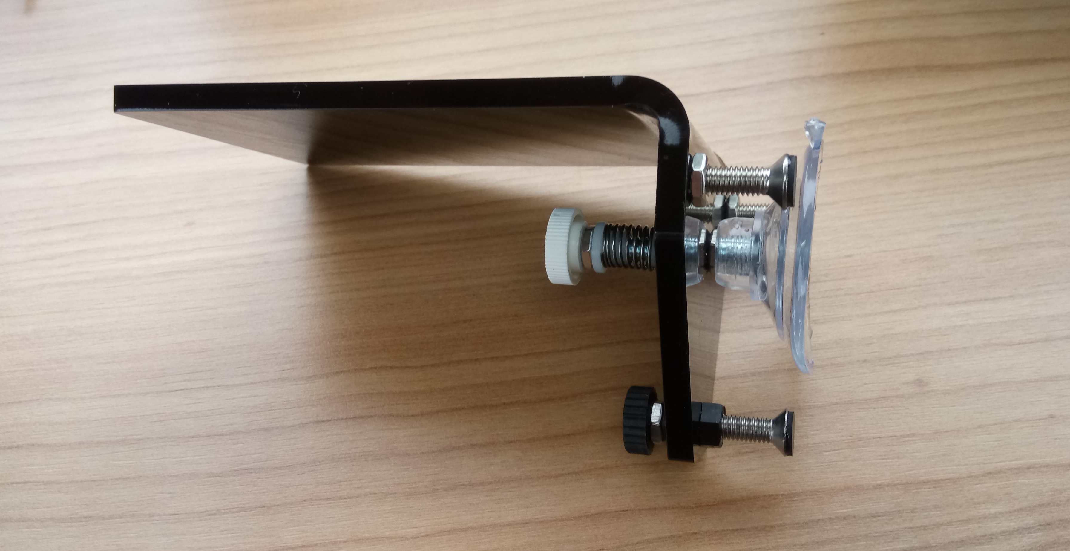 The side panel attachment has a spring loaded suction cup along with non scratch pads on the pre-calibrated screws to hold vertical on side wall, if your side wall is not vertical the calibration screw is adjustable.