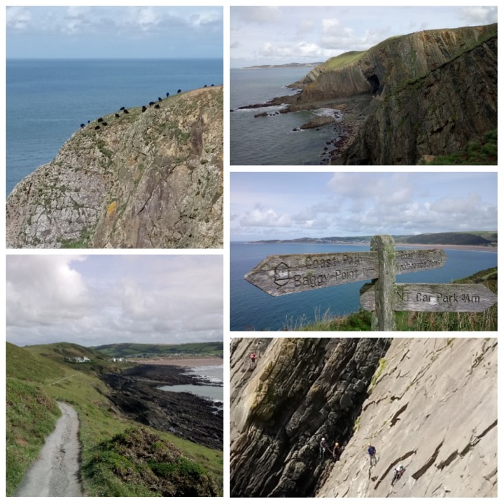 “ACTION” A young woman, babe in arms, is being harassed and surrounded by a man and woman taunting her, they appear to want the baby, she flees, they chase, another man appears and blocks her path. This is now playing out two feet in front of our bench. Three people are now grappling and pulling the young woman before tearing the baby (a doll prop) from her arms. As she is held back the baby is carried to the cliff edge, she is released and runs desperately towards her child only to see it thrown over the cliff before her eyes. We are gripped by the unfolding drama but one can only imagine how it would have looked to people approaching without realising it was theatre. The Actors walk back congratulating each other on a good scene but the props are left. A father and two sons round the bend, Dad spies the Welsh coastline and sends the boys ahead “Run ahead lads and tell me what you can see” …. “Err, Dad”.. pause… “a dead baby in a bush”. To say that Dad’s expression was priceless would be an understatement.