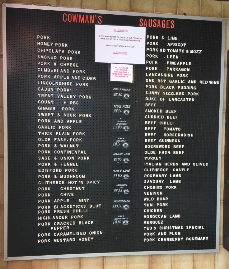 Sausages. This may be the real underlying reason we came to Clitheroe. Cowman’s Famous Sausage Shop sells an amazing choice of sausage varieties under one roof. Years ago they had baskets of samples on the counter, but after pretending you weren’t sure which one you liked the most as you worked your way through six baskets, you no longer were hungry or needed to buy sausages. Maybe they still have them but remembered our faces from twenty years ago and swept them quickly under the counter. We buy four flavours, Pork & Black Pudding, Pork & Apple Cider, Pork with Honey & Mustard and Pork and Garlic. Only when we cooked them later did we remember that real sausages don’t erupt gallons of boiling fat when pricked, not a drop of fat escaped and they were tasty, tasty, tasty. We even sneaked back a few days later for even more flavours… that good.