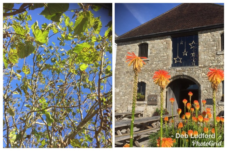 Modern buildings with wall remnants as features in their gardens. Beautiful, blue skies betray the chill in the air. Autumn is on its way, leaves are starting to change colour and fall. Sweatshirts are on but true Ludford style we’re both still wearing shorts.