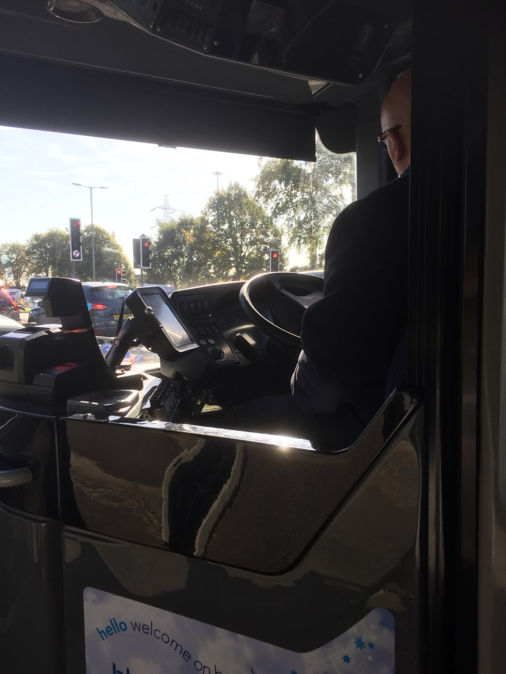 With the dealer being a good way out of town he’s decided we are going to catch a bus to kill time. Buses and me don’t mix. We squeeze ourselves into a blue double decker full of walking frames and prams. With standing room only we are squished in the middle of a rather nattily dressed elderly couple, a screaming toddler and two young, eightyish year old love birds holding hands and sitting closely together. Cough, sneeze, splutter, buses are mobile germ wagons. An automated voice tells us of an approaching stop, completely inaudible due to smoker’s coughs and hearing aids not being turned up enough.