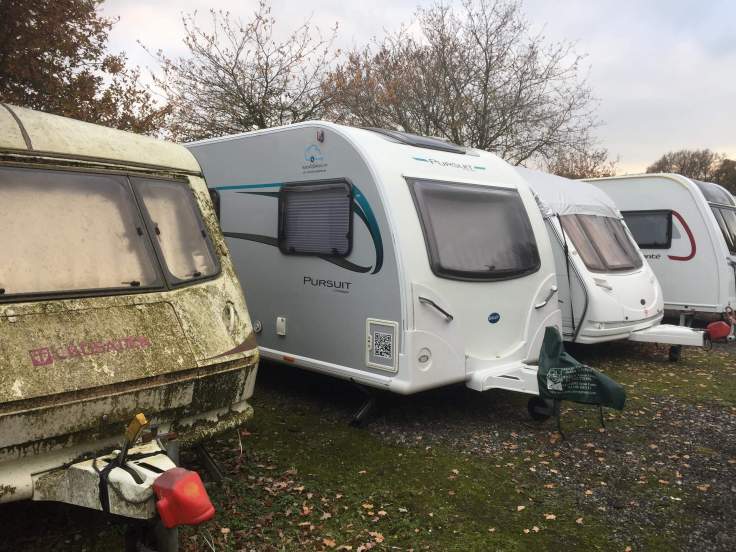 The day came where we had to lift the legs one final time and reluctantly tow back to our storage yard. Good storage near us costs an arm and a leg and spaces are as rare as rocking horse poo. We’d decided before going to work on site, that purely to have somewhere local and safe to store the van over winter that we’d continue to pay for storage, even though our space would stand empty for most of the year. With a heavy heart I watched as The Boss reversed it into its spot. It was still raining and the freshly scrubbed and polished caravan was hidden under muck and grime thrown up from the drive back. Legs down and time to lock the door of what I now call my home and go home. I really didn’t want to leave it. It had served us so well that it felt wrong to abandon it in the cold and the rain.