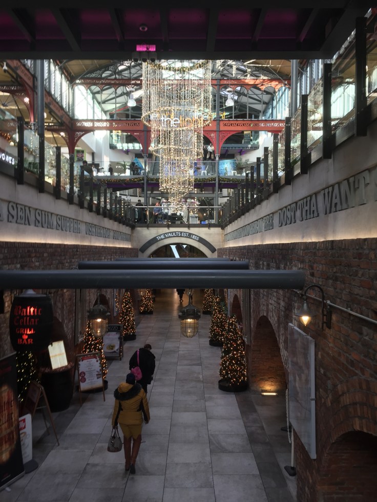 The Market Hall, once a thriving place of retail, hustle and bustle seemed to have had the energy, the history and maybe even the soul sucked out of it the last time we were here around six years or more ago. Today, we are pleasantly surprised, a buzz seems to have returned and retail outlets that had stood empty on our previous visit now stand proud adorned with Christmas decorations with their doors open welcoming people. It’s had some major work done over the last few years. The Vaults are now exposed. Once a basement in the bowels of the building where stall holders probably stored excess stock, has been overhauled and had it’s original brick arches revealed and is now the home to restaurants and cafes with a crazy golf, soft play and cinema thrown in for good measure. All around good old Bolton quotes decorate the building, “Dost tha want summat t’eyt?” “Tha can get sum reet good grub in ‘ere.” Love a bit of good old Lancy Twang.