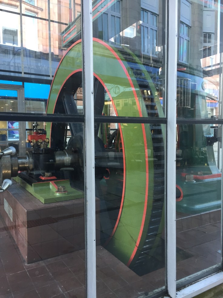 Walking away from McDonalds, Fred Dibnah, steeplejack,stands tall and proud, with a cheeky grin on his face. One of Bolton’s national treasures. Behind him a great glass encased steam engine, a reminder of the town’s history and roots.