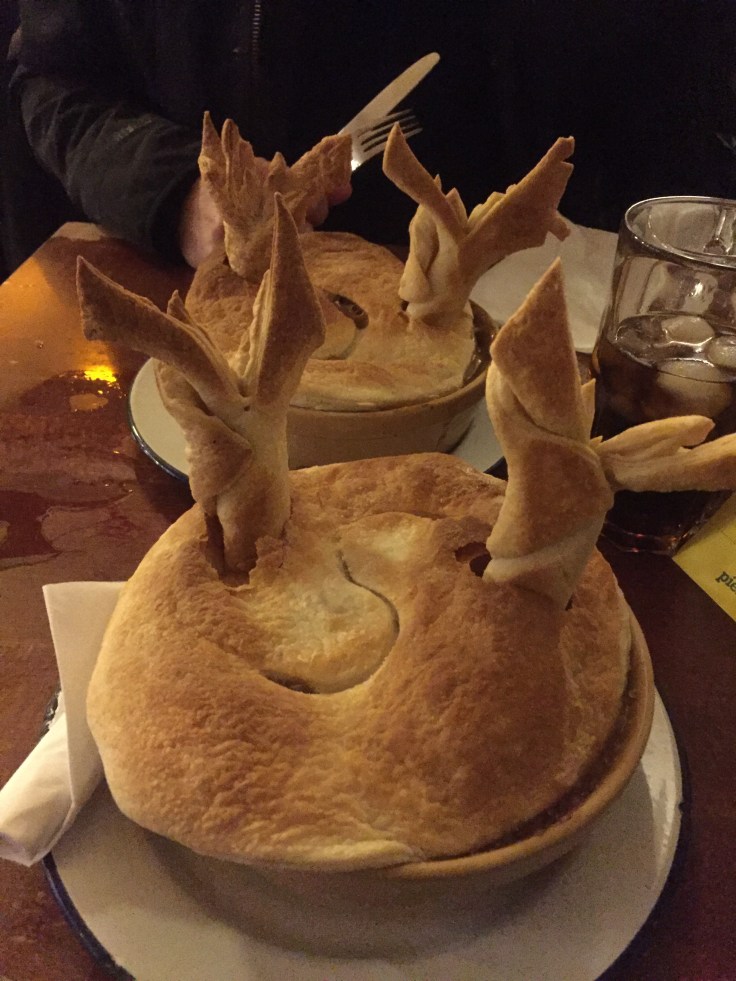 It’s busy with Christmas parties and couples feasting before heading out on the town. Food arrives quickly and is piping hot and it really is a Christmas dinner in a pie. It’s the size of my head complete with antlers, turkey, whole roast potatoes, full sprouts, carrots, cranberry sauce, stuffing and pigs in blankets.