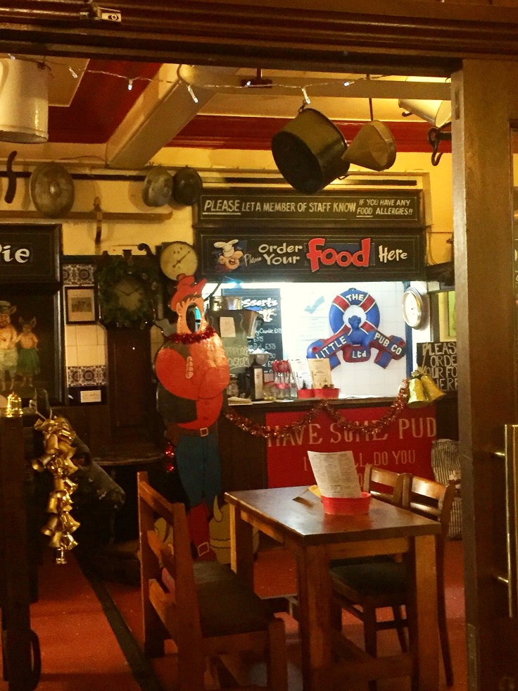 Apparently it hasn’t changed over the years, a noisy, old fashioned pub complete with original tiled walls and wooden floorboards. We are shown to our table and left to ponder the menu. It’s Christmas, we choose the Santa Pie. Described as a complete Christmas dinner in a pie. You order at the food counter and then go to the bar to order your drinks.