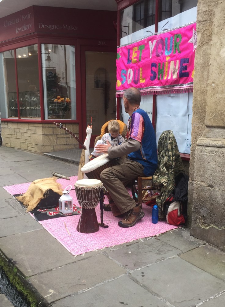 Water continues to flow down Cheap Street as Buskers entertain the crowds.