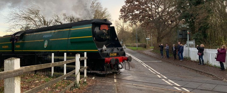 Boots and big coats on and we head out of site for a walk. The Boss has already Googled the timetable of the Nene Valley railway that runs along the edge of the site, there’s a train due, “Come on! Walk faster!” He yells back as his longer legs stride off. My little legs go ten to the dozen trying to keep up. The world and his wife seem to have beaten us to the vantage point that he wanted for that perfect photo. He crosses the road and stands glaring at the masses whilst pressing the shutter as the Santa Special slowly chugs past.