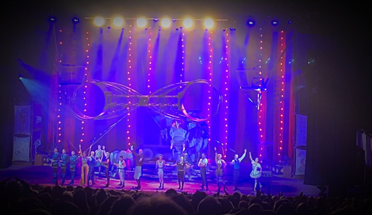 Not long to tramp round before the curtain rises and the Ring Master welcomes us to The Royal Festival Hall and transports us back to 1903 where Health and Safety hadn’t been invented and it was feasible to drag children round by their hoods. Juggling acts, contortionists, balancing acts, a lady with a zillion hula hoops. Men on stilts parade around whilst human propelled elephants cause havoc on the stage. A fantastic afternoon’s entertainment for old and young.