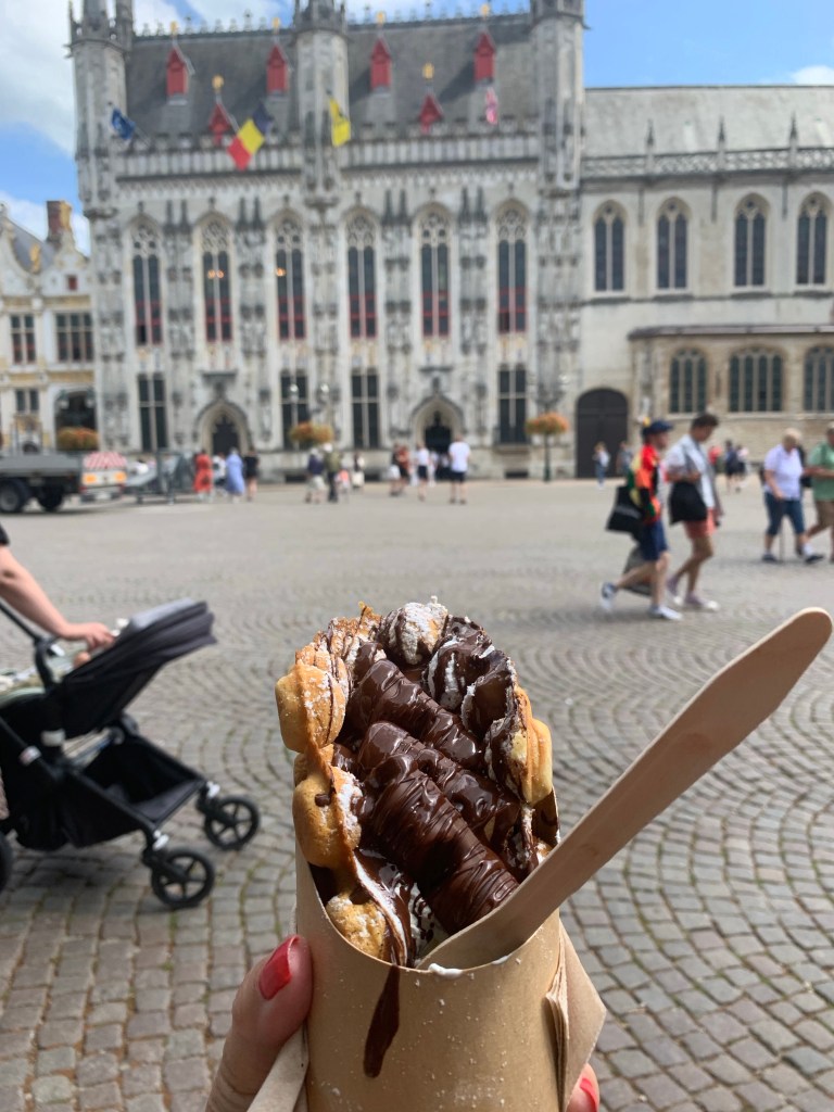 Bruges is beautiful, bustling with tourists. Last time we were here we found an underground bike park, a bit like a multi storey car park but just for bikes, hundreds of them, so that’s where the bike spent it’s afternoon. All parked up for free too. We’ve been here twice before so after a bit of a mooch we decided to find a bar with a bit of shade. Plonked in just the right spot to watch the world go by we sit back and relax. We even chatted to the locals on the next table (from Coventry). Before heading back we treated ourselves to Waffles with Maple & Kinder Beuno, because you have to, don’t you?