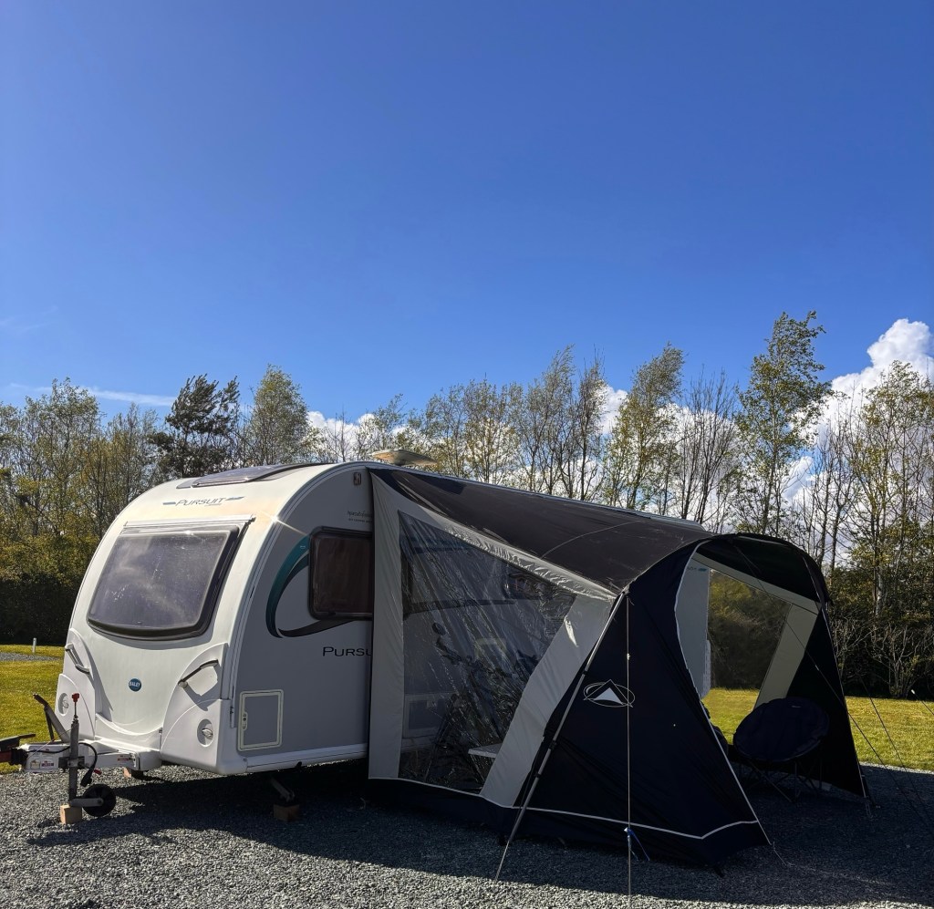 A short ride down the road led to a Co-op, where Steve stayed loyally with the tandem while I was dispatched to find chocolate. I returned triumphant, two bars of Dairy Milk Daim and a carrot cake (because balance is important). With a less than promising weather forecast for tomorrow, I’m fully anticipating a day of tea, cake, and crocheting.