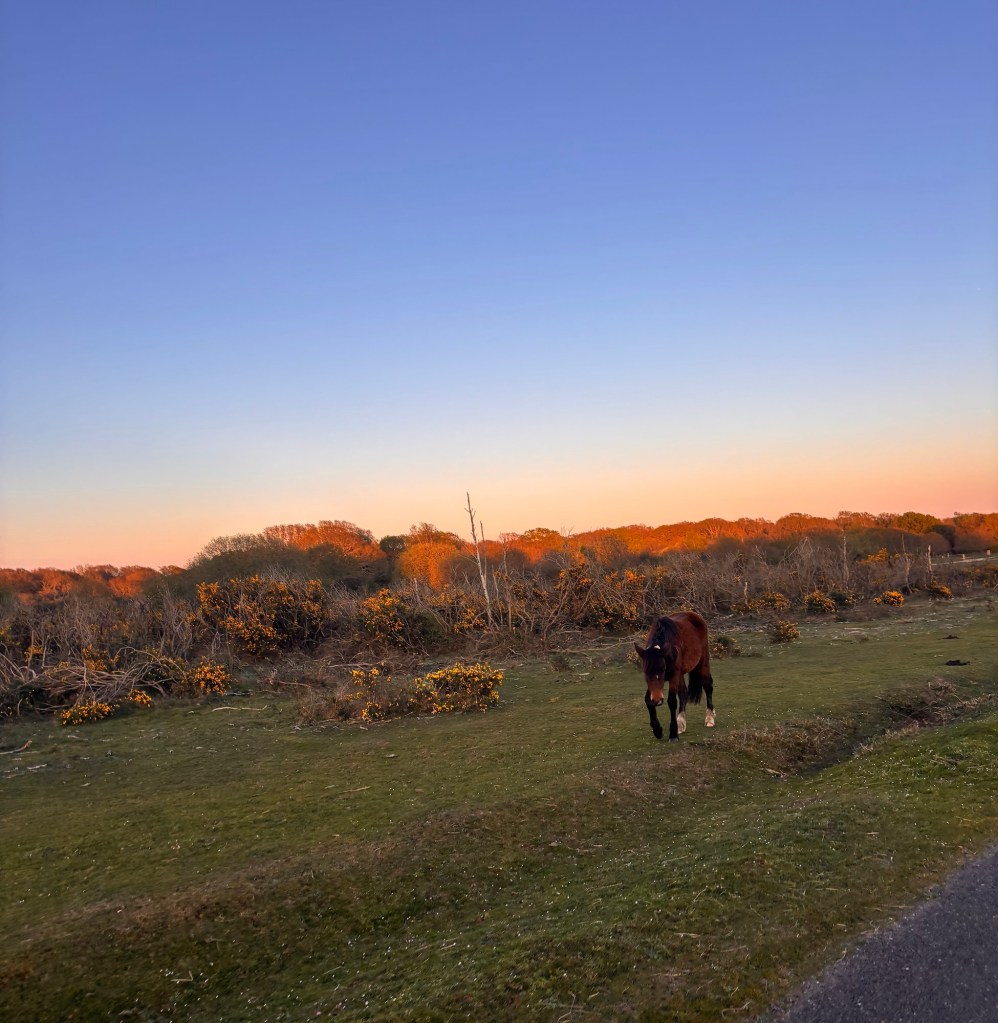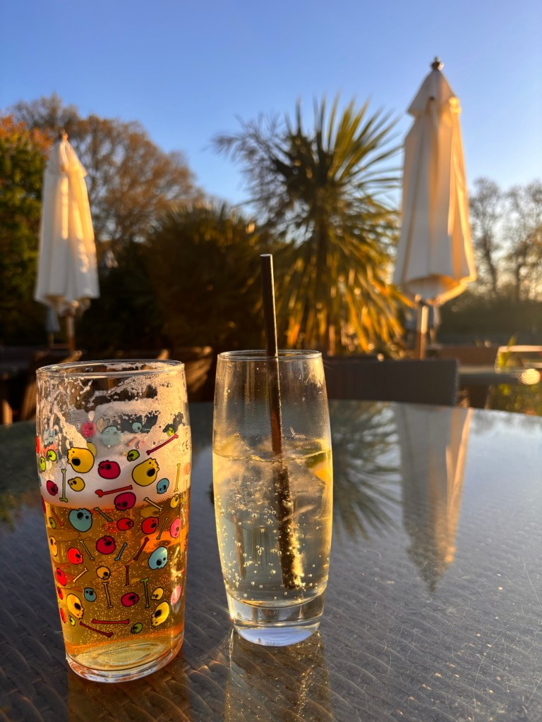 Our destination was Bransgore, a lovely little village complete with a handful of shops, three pubs, a church, and the obligatory free-roaming New Forest ponies on the approach, just before the cattle grid. We stopped at The Crown’s beer garden for what I optimistically called a “quick” drink. At just under £9 for a pint and a lime and soda, you’d better believe we savoured every single sip.