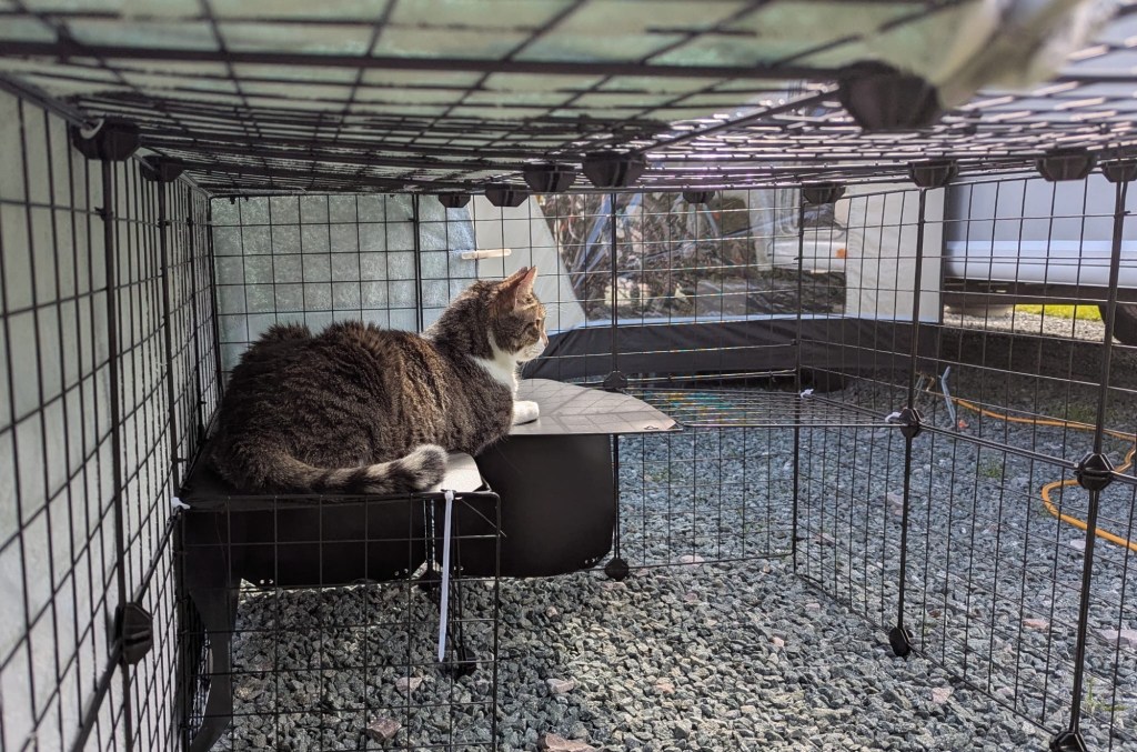 Steve built him a little pen (basically Oscar’s luxury penthouse suite), complete with a shelf where he can sit and silently judge passersby. He’s perfectly happy in there for hours, watching the world go by like a retired gentleman with strong opinions about the neighbourhood.