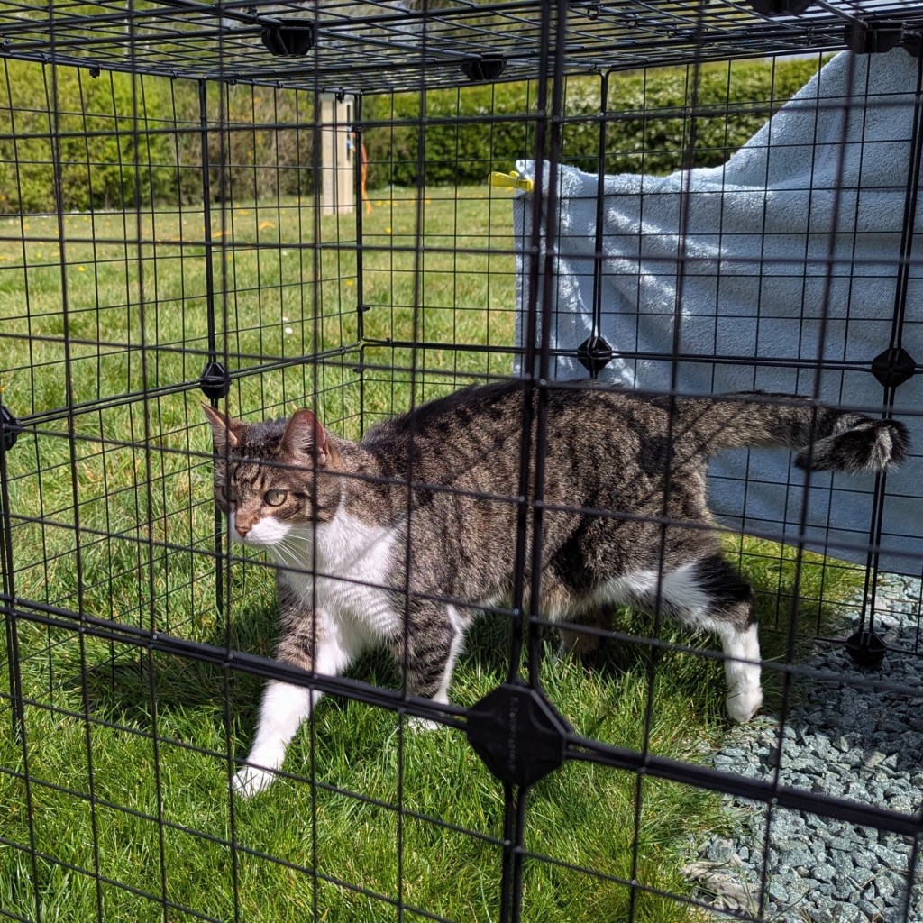 The next day, I’m introduced to something even more curious, a large cage. I feel like a lion in a zoo, which seems appropriate given my presence. I pace, take stock. Food, water, litter tray. Acceptable accommodations.