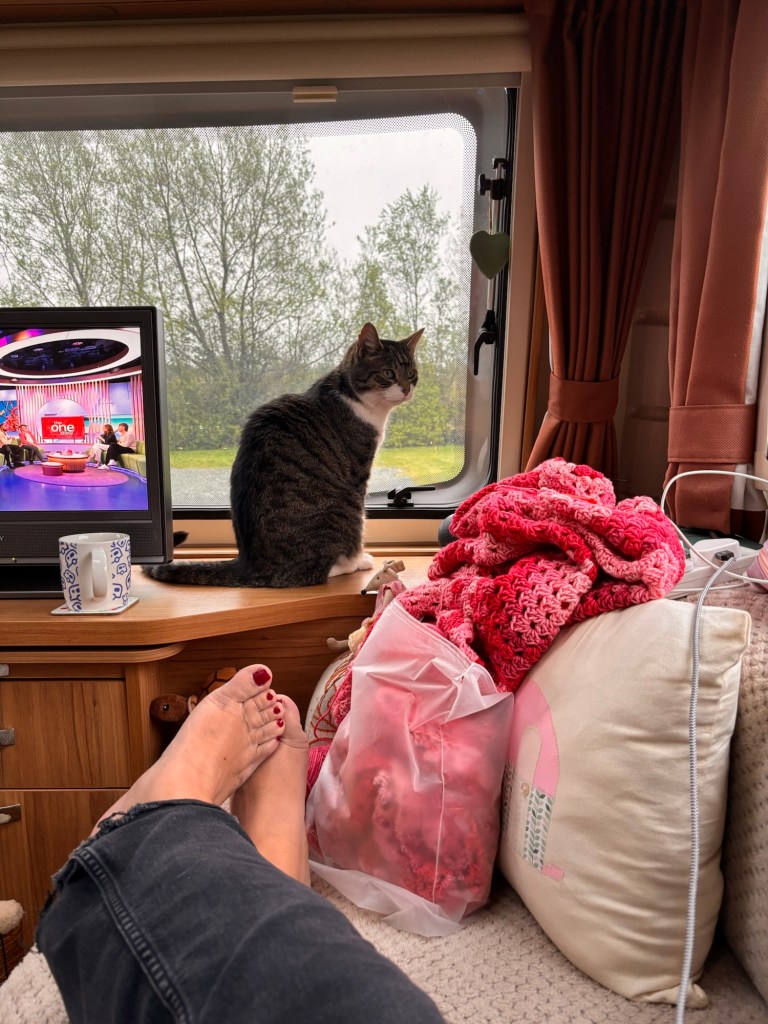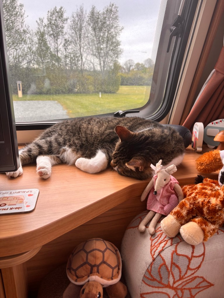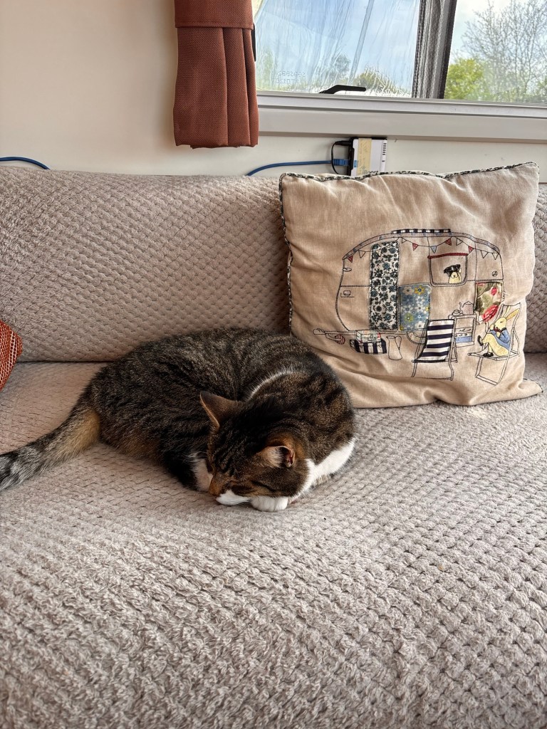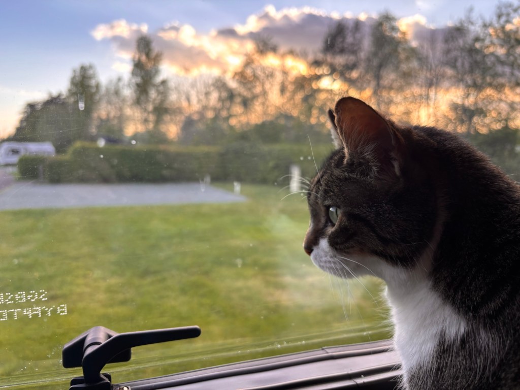 He sits watching outside through the caravan window muttering to himself. I join him on the windowsill to supervise. A large dog passes. From my elevated position, I issue a low grumble to establish authority. The dog continues walking. I’ll take that as respect.